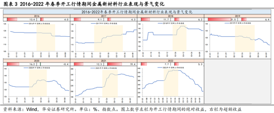 金属新材料行业在过去7年的开工行情中全部斩获了正收益,仅有2020年没有产生超额收益但也并未出现显著差距,其余6个年份均有超额收益。