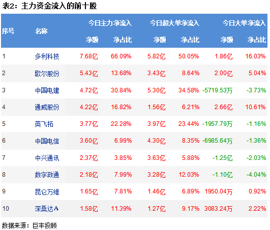 从两市个股主力资金流向来看,多利科技获主力资金净流入7.68亿,歌尔股份获主力资金5.43亿净流入,中国电建获主力资金净流入4.72亿,通威股份获主力资金净流入4.22亿,英飞拓获主力资金净流入3.77亿。