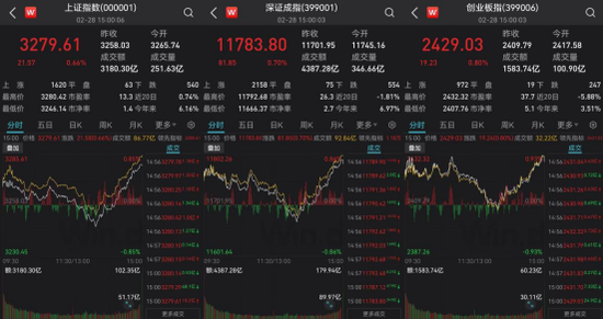 2月28日,A股早盘小幅高开后逐步震荡走低,三大指数午后集体翻绿,但随后开启“V”形大反攻。截至收盘,沪指涨0.66%,深成指涨0.70%,创业板指涨0.80%。北向资金全天净卖出13.04亿元,其中沪股通净卖出9.95亿元,深股通净卖出3.09亿元。
