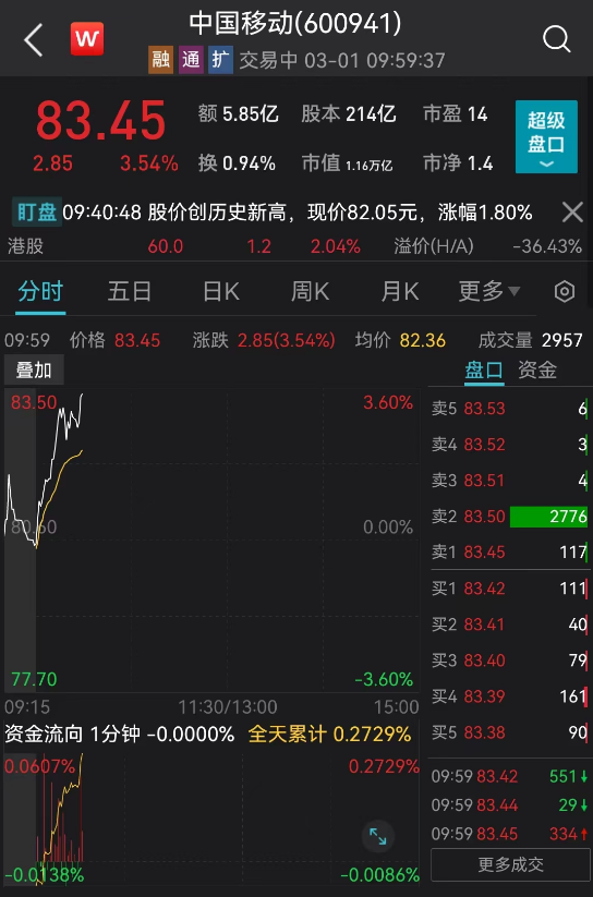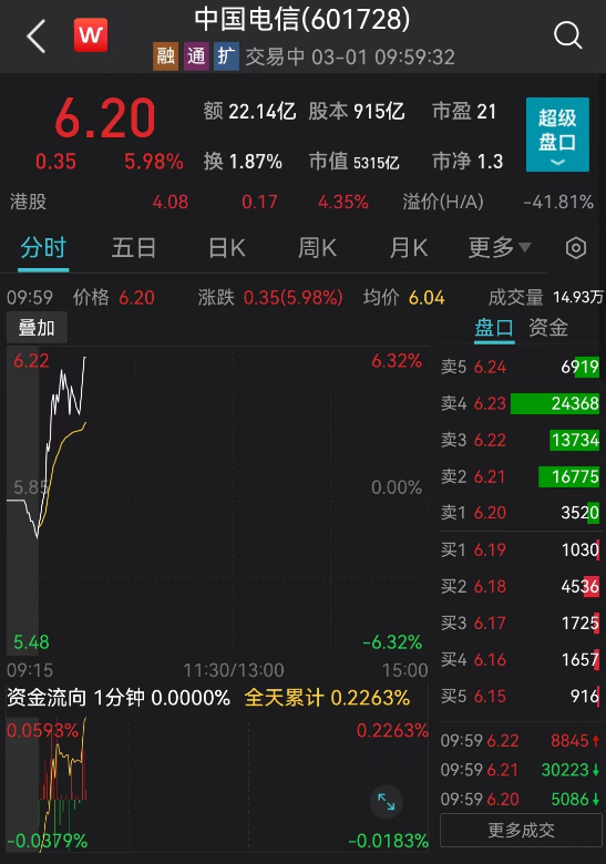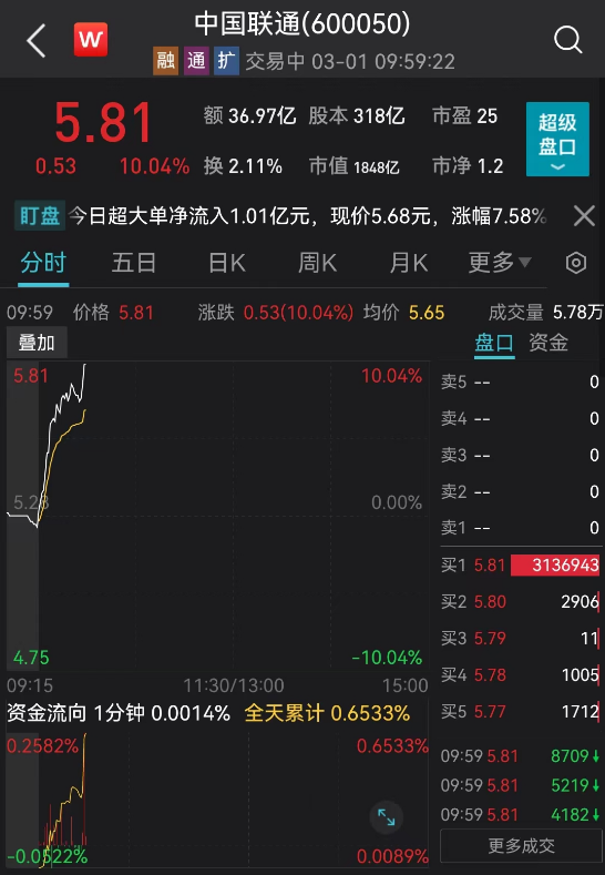 三大运营商继续飙涨,股价轮番创新高:中国联通强势封板,股价飙涨至5.81元,市值来到1848亿元。中国电信涨近6%,中国移动涨超3%,仍在上攻。