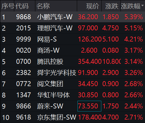 开盘后,恒指涨幅迅速扩大至1%,恒生科技涨超2%,科技股走高,小鹏汽车、理想汽车涨超5%,网易涨超4%。