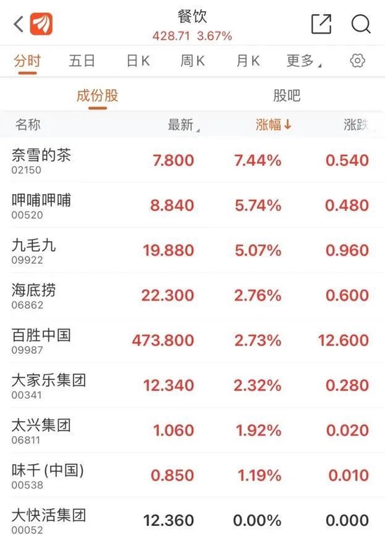 其他餐饮股也纷纷大涨,奈雪的茶涨7.44%,报7.8港元/股;呷哺呷哺涨5.74%,报8.84港元/股;九毛九涨5.07%,报19.88港元/股;海底捞涨2.76%,报22.3港元/股。