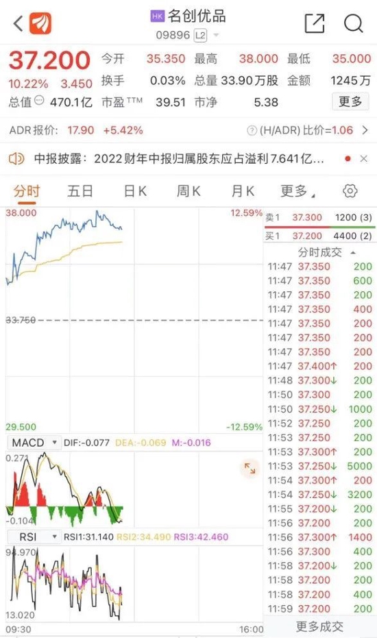 3月1日,港股名创优品开盘涨4.74%,随后涨幅不断扩大,盘中股价创上市新高,截至午盘涨10.22%,报37.2港元/股,成交额为1245万港元,总市值为470.1亿港元。