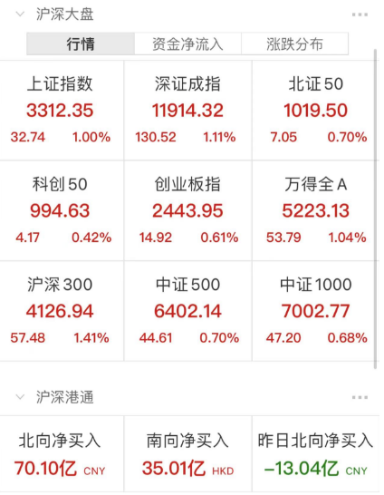 三大指数今日低开高走,沪指午后涨超1%,突破3310点,创出本轮反弹以来新高。截止收盘沪指涨1%,深成指涨1.11%,创业板指涨0.61%。