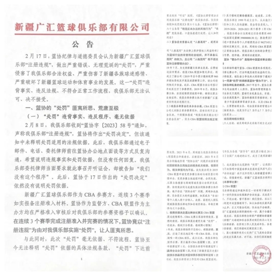 2月17日,中国篮协在官网上发布了一则处罚通知,认定新疆广汇存在参赛主体混同等问题,构成注册违规,并对新疆广汇作出处罚。