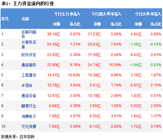 从两市行业板块资金流向来看,互联网板块获主力资金净流入36.18亿,计算机设备板块获主力资金净流入24.35亿,软件开发板块主力资金净流入23.93亿,通信服务板块主力资金净流入22.80亿,工程建设板块主力净流入18.47亿。