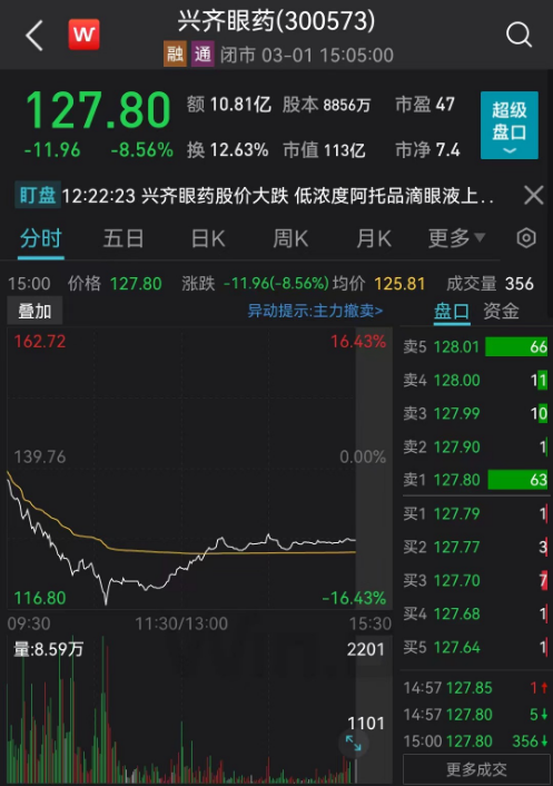 兴齐眼药早盘跳水,盘中一度重挫超16%。截至收盘,兴齐眼药下跌8.56%,收报127.8元/股,市值113亿元。