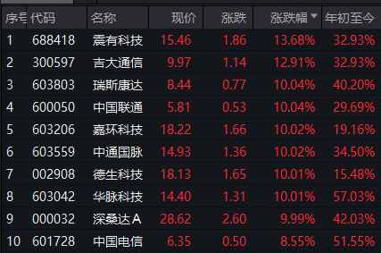 在中国联通涨停的带动下,以三大运营商为主的电信板块今日也表现突出,近10股涨停,中国电信大涨8.55%,中国移动涨近5%。