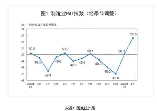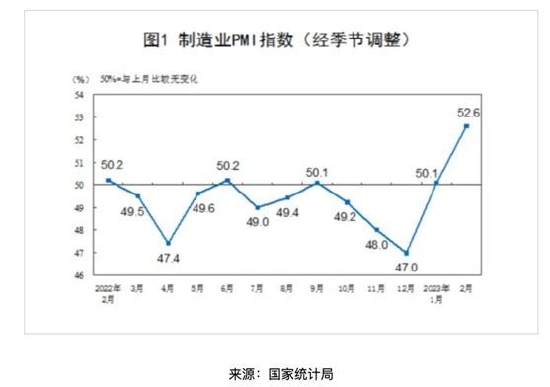 国家统计局3月1日公布数据显示,2月制造业采购经理指数、非制造业商务活动指数和综合PMI产出指数分别为52.6%、56.3%和56.4%,分别高于上月2.5、1.9和3.5个百分点,三大指数均连续两个月位于扩张区间。