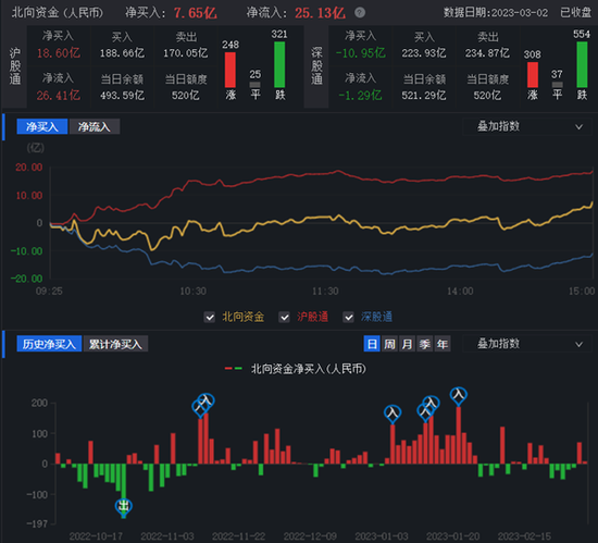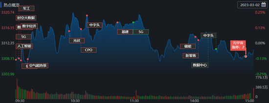 3月2日,沪深两市三大指数表现为震荡下行,不过,沪指继续创出3320.74点的年内新高,并且全天都维持在3300点之上运行。截至收盘,上证指数跌0.05%报3310.65点;深证成指跌0.54%报11849.51点,创业板指跌1.04%报2418.60点,两市合计成交额9335亿元,北向资金净买入7.65亿元,其中沪股通净买入18.60亿元。总体上看,A股中涨少跌多,有1710只上涨,3183只下跌。