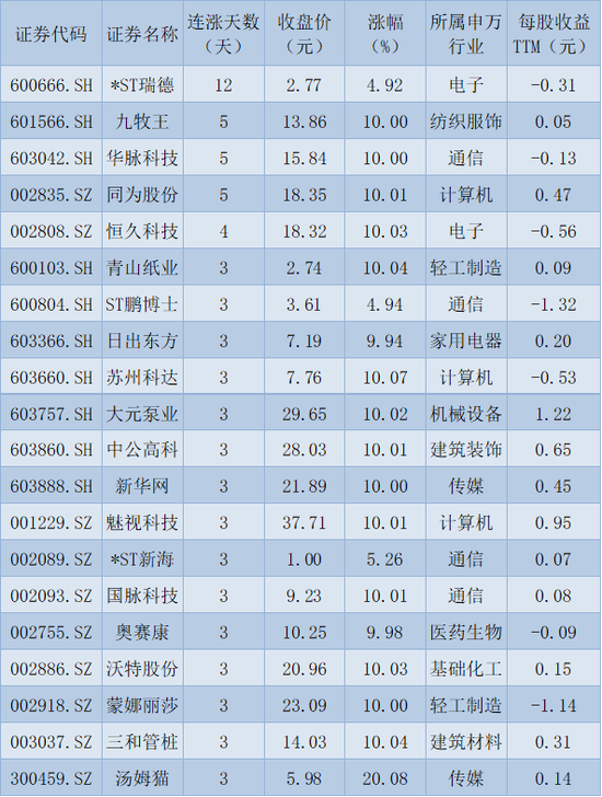 涨停股方面,今日有29只个股以涨停价报收,其中,有20只个股股价已连续上涨超过3个交易日;跌停方面,有10只个股跌停价报收。从申万一级行业看,通信行业涨停股数量居首,为4只,计算机、纺织服饰和电子紧随其后,涨停股数均3只。