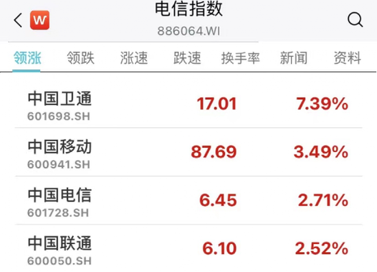 电信股再度拉涨,中国卫通涨超7%,中国移动涨超3%。