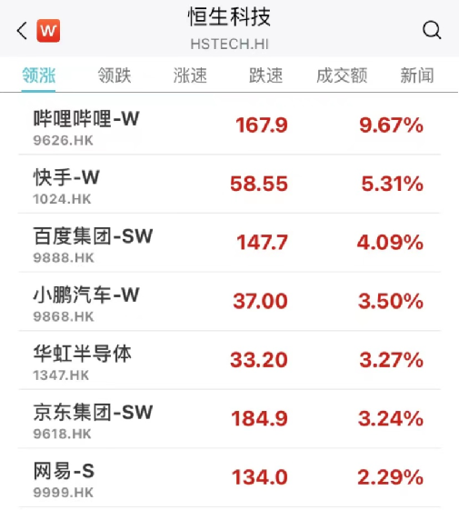 港股方面,三大指数震荡收红,哔哩哔哩涨超9%,百度集团、快手、京东集团、小鹏汽车等涨超3%。