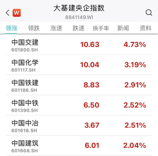 中字头个股集体拉升,大基建板块继续活跃。中国交建、祥龙电业涨超5%,中国化学、中国铁建、中国中铁等跟涨。