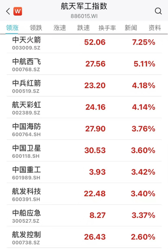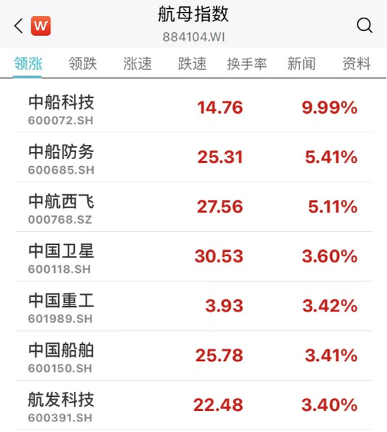 此外,国产航母板块异动拉升,航天军工股表现活跃,中船科技拉升涨停,中国卫通、中天火箭涨超7%,中船防务、中国重工、中航西飞等跟涨。