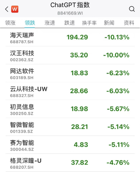 ChatGPT概念股走低,AIGC、人工智能等方向跌幅居前。汉王科技跌停,海天瑞声跌超10%,云从科技、神州数码、拓尔思、天娱数科、神州泰岳等跟跌。