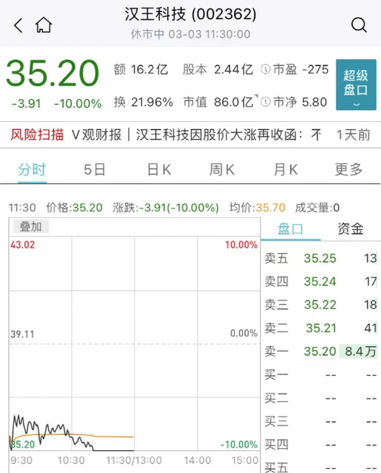 市场焦点股方面,汉王科技盘中跌停,报35.2元,总市值86亿元。昨晚,汉王科技收深交所关注函,要求详细说明近期接待机构、个人投资者调研,以及在互动易回复投资者提问的情况,是否存在违反信息公平披露的情形。