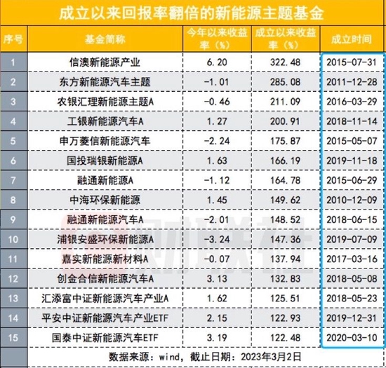财联社记者统计显示,市场中成立以来回报率翻倍的新能源主题基金共15只,这些翻倍基金成立时间均在2020年之前。