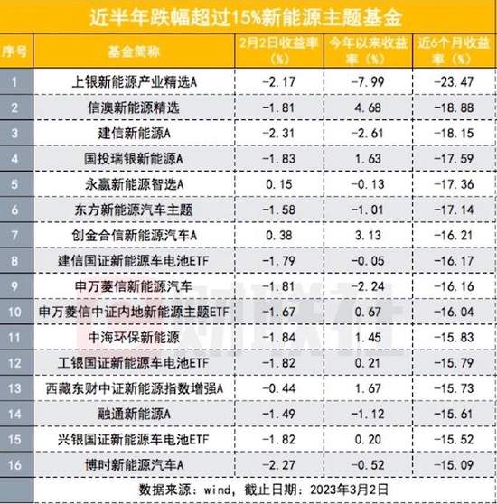 Wind显示,当前全市场不同份额合并计算的新能源基金共计75只,从近半年收益率来看,截至3月2日,上述全部基金收益率为负,16只基金亏损超过15%,其中去年4月成立的上银新能源产业精选混合收益率最差,近6个月涨幅为-23.47%,相对较好的万家新能源主题同期收益率为-1.03%。