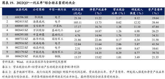 在财务指标维度,应关注央企的考核体系由“两利四率”向“一利五率”的转变。2023年,国资委进一步优化完善中央企业经营指标体系,将“两利四率”调整为“一利五率”。在原先的考核体系下,“两利”即利润总额、净利润,“四率”即营业收入利润率、全员劳动生产率、研发投入强度、资产负债率;而“一利五率”则是将净利润改为ROE,另外营业收入利润率改为营业现金比率,进一步加强了对国企的盈利能力和创现能力的考核,推动国企高质量发展。因此,应关注“一利五率”综合得分靠前的央企。