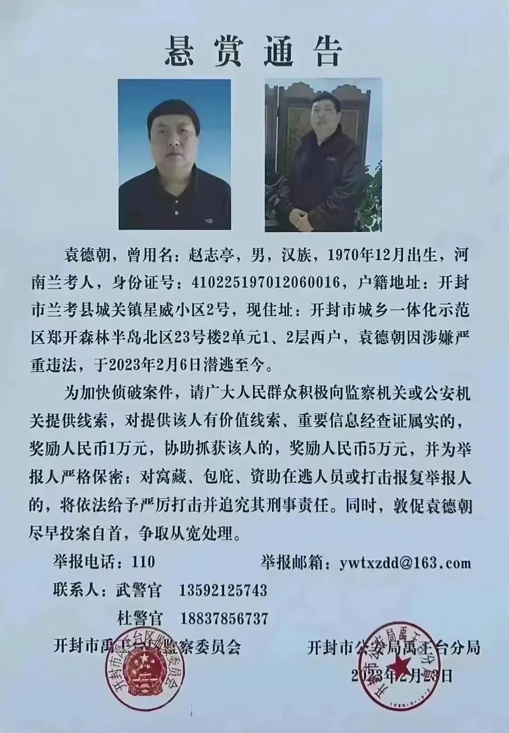 值得注意的是,今天,一份悬赏“袁德朝”的通告引起网友关注。有网友发现该人疑似为河南省兰考县政法委原副书记、兰考县原法学会副会长。据东方网·纵相视频报道,记者致电悬赏通告下方的警官联系电话,对方表示此人“曾经是”这一身份,并表示市民提供有价值线索奖励1万元,协助抓获奖励5万元。