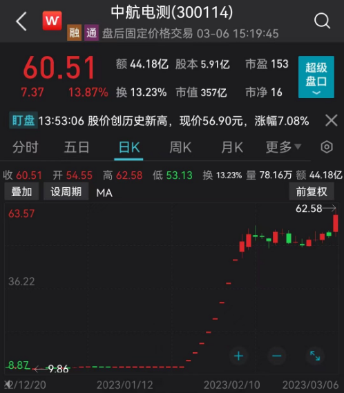 2023年以来最大牛股中航电测,今日午后再度大幅走高,收盘涨近14%,再创历史新高。2023年以来,中航电测已累计大涨490%。