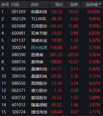 以光伏为代表的新能源赛道今日回暖,光伏、储能、TOPcon电池、风电等板块领涨。截至收盘,欧晶科技涨停,TCL中环、石英股份涨逾9%,阳光电源、晶澳科技、固德威等涨逾5%,“光伏茅”隆基绿能涨近4%。Wind数据显示,3月6日光伏板块总市值近3万亿元。