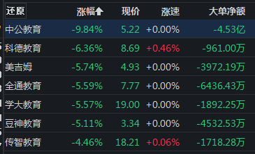 此外,教育股持续走低,中公教育触及跌停,科德教育、豆神教育、美吉姆、学大教育等跌超5%。
