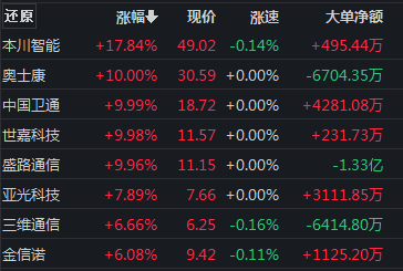 受益全国两会利好消息发酵,6G概念再度走强,板块上涨近5%。个股来看,本川智能涨超10%,世嘉科技、盛路通信涨停。