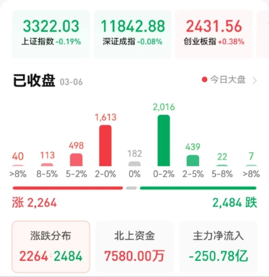 周一(3月6日),A股三大指数震荡整理,涨跌不一。截至收盘,上证指数跌0.19%报3322.03点,深证成指微跌0.08%报11842.88点,创业板指涨0.38%报2431.56点;两市合计成交9509亿元,北向资金净买入7580万元。总体上看,两市个股跌多涨少。其中,涨停个股达31只,跌停个股2只。