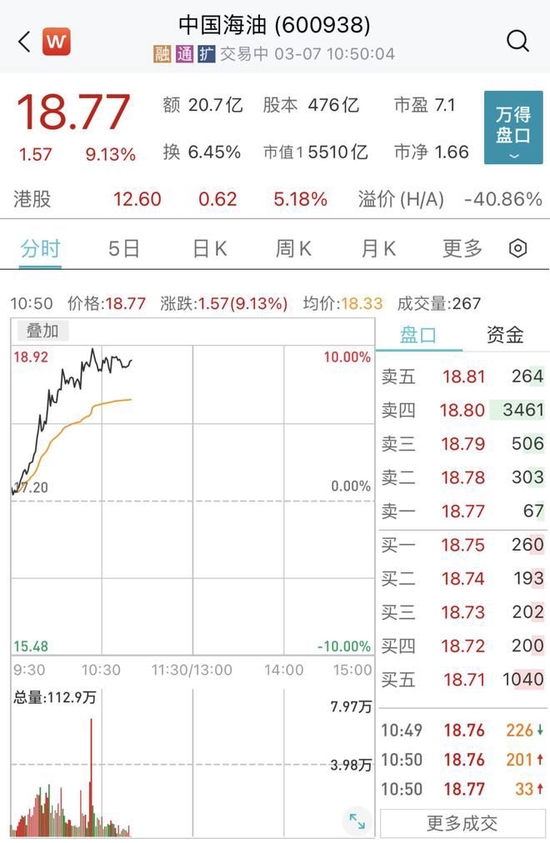 7日早盘,“三桶油”全线爆发,中国海油放量冲击涨停,股价最高报18.92元创上市以来新高,总市值逼近9000亿元大关;中国石化盘中涨近7%;中国石油盘中最高涨近6%。