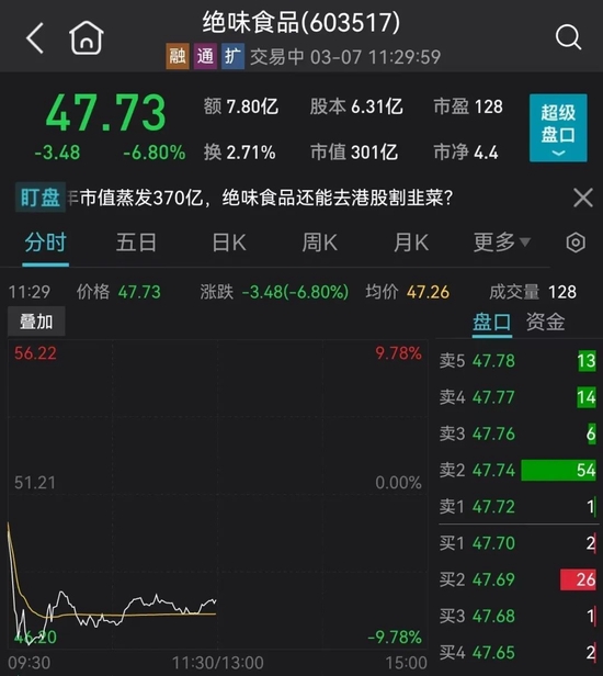 7日早盘,卤味三巨头之一绝味食品盘初跳水,股价逼近跌停至46.2元。截至午间收盘,仍然下跌近7%。