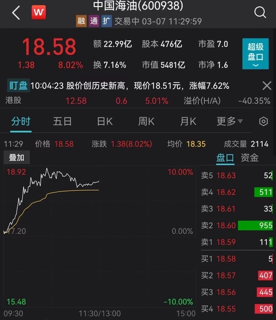 5000亿中海油逼近涨停