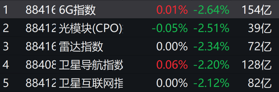 沪深两市近4000只个股下跌,科技股领跌,近期强势的6G概念大幅回落,5G、芯片、消费电子等概念跌幅靠前。