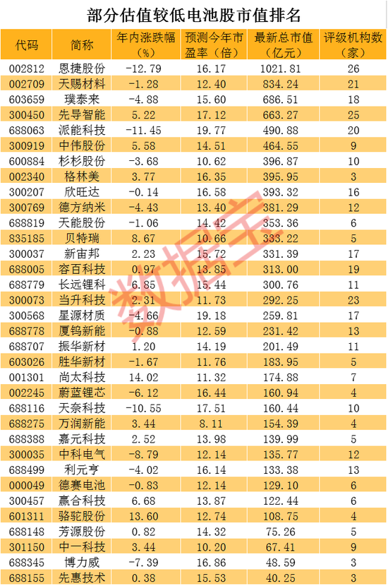 根据机构一致预测的2023年净利计算,部分电池板块个股估值优势凸显。其中,4家机构评级的万润新能,一致预测今年市盈率不足9倍,榜单最低。其他个股方面,中一科技、杉杉股份、贝特瑞等个股预测市盈率只有10倍多,距离个位数仅咫尺之遥。部分龙头股估值也较低。比如千亿市值的恩捷股份,预测市盈率不足17倍。另外,天赐材料、璞泰来、先导智能等个股预测市盈率均在18倍以下。