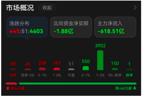 通联数据显示,沪深两市全天成交额约9326亿元,较前一日缩量182.64亿元。北向资金全天净流出1.88亿元,而前一日为净流入0.76亿元。盘面上,全市场下跌个股多达4600余只,上涨个股仅400余只。涨停个股有30只,跌停个股仅1只(ST明诚(维权))。