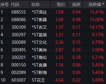 临近年报集中披露期,部分资金再度炒作“摘星脱帽”概念,今日ST板块出现“异动”,*ST泽达、*ST紫晶、*ST吉艾涨超14%,还有超10只ST股涨停(5%)。