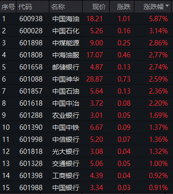 盘面上,三桶油早盘大涨,以中字头为主的央企概念股全天表现突出,中国海油涨逾5%。银行股盘中异动,西安银行一度涨停,邮储银行涨超2%。ST板块午后逆势走强,超10股涨停,*ST吉艾、*ST泽达(维权)、*ST紫晶(维权)涨超14%。贵金属、煤炭、油气等板块涨幅居前。