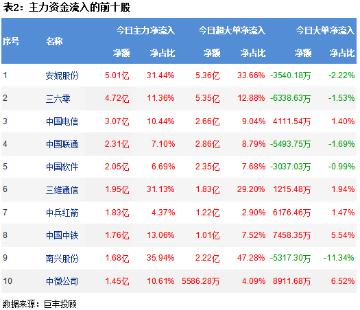 从两市个股主力资金流向来看,安妮股份(维权)获主力资金净流入5.01亿,三六零获主力资金4.72亿净流入,中国电信获主力资金净流入3.07亿,中国联通获主力资金净流入2.31亿,中国软件获主力资金净流入2.05亿。