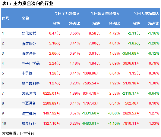 从两市行业板块资金流向来看,文化传媒板块获主力资金净流入6.47亿,通信服务板块获主力资金净流入5.18亿,通信设备板块主力资金净流入2.66亿,电子化学品板块主力资金净流入2.24亿,半导体板块主力净流入1.28亿。