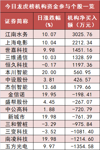 盘后龙虎榜数据显示,机构现身16股,其中江南水务等8股现机构资金净买入,五方光电等8股呈现机构资金净卖出。