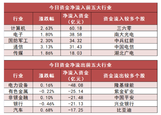 申万一级行业中,10个行业实现资金净流入,其中计算机行业净流入60.18亿元居首。