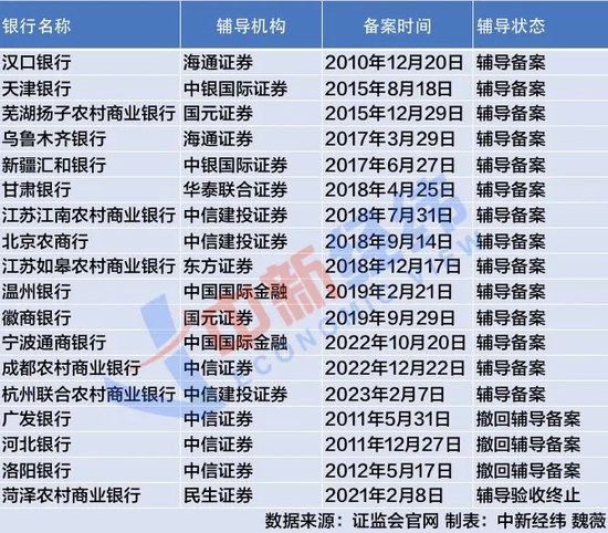 近年来,已有多家中小银行加入上市的“后备军”中。据证监会网站上公开发行辅导公示信息显示,目前有14家银行仍处于辅导备案状态。其中包括汉口银行、天津银行、徽商银行、甘肃银行、温州银行、乌鲁木齐银行、新疆汇和银行、宁波通商银行共8家城商行,以及北京农商行、成都农商行、江苏江南农商行、江苏如皋农商行、杭州联合农商行、芜湖扬子农商行6家农商行。