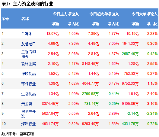从两市行业板块资金流向来看,半导体板块获主力资金净流入18.07亿,航运港口板块获主力资金净流入4.69亿,工程咨询板块主力资金净流入2.54亿,能源金属板块主力资金净流入2.10亿,橡胶制品板块主力净流入1.52亿。