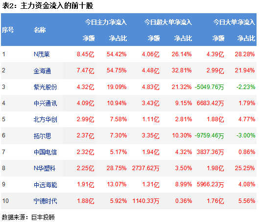 从两市个股主力资金流向来看,N茂莱获主力资金净流入8.45亿,金海通获主力资金7.47亿净流入,紫光股份获主力资金净流入4.32亿,中兴通讯获主力资金净流入4.09亿,北方华创获主力资金净流入2.99亿。
