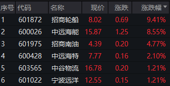 今日海运板块大涨,位居两市涨幅榜前列,招商轮船、中远海能均大涨逾8%。