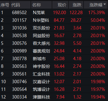 今日市场的一大亮点是创业板多只个股“20CM”涨停。截至收盘,除了今日上市的两只新股外(其中之一是创业板新股N华塑科,上涨逾50%),今日A股涨幅榜前十均是创业板个股,且全部“20CM”涨停。