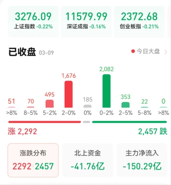 周四(3月9日),A股三大指数震荡整理。截至收盘,上证指数跌0.22%报3276.09点,深证成指跌0.16%报11579.99点,创业板指跌0.21%报2372.68点;两市合计成交7566亿元,北向资金净卖出41.76亿元。总体上看,两市个股跌多涨少。其中,涨停个股达35只,跌停2只。