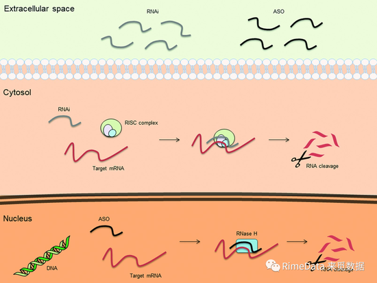 合成性的反义寡核苷酸(ASO)从结果上来说,与RNAi一致皆是通过序列互补机制来靶向mRNA的翻译阶段。ASO长度约为20个核苷酸,可以通过与目标mRNA的结合来引导对翻译的空间抑制,从空间上阻止 mRNA 与核糖体的相互作用以及后续的蛋白质翻译,以及通过诱导核糖核酸内切酶RNase H来实现对mRNA的切割。