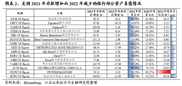 我们统计了美国银行资产负债情况,2021年存款大幅增加而2022年减少的银行规模不大,集中于硅谷银行及为加密货币行业提供服务的两家银行,Silvergate Bank及Signature Bank。3月初,Silvergate Bank的控股公司Silvergate Capital Corporation宣布将推迟提交2022财年财报,Silvergate表示,“公司目前正在分析与公司有关的某些监管询问和调查”并于3月9日宣布,将清算其为加密货币行业提供服务的子公司Silvergate Bank。